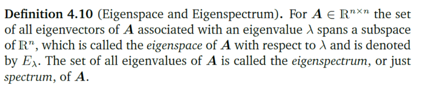 $A$에 모든 고유벡터들은 고유값과 함께 span을 하게 된다. 이때의 span 하는 공간을 $\lambda$에 의해 정의되는 $A$의 eigenspace라고 하고 $E_{\lambda}$로 표기한다. $A$의 eigenvalue들의 집합을 eigenspectrum 또는 spectrum이라한다.