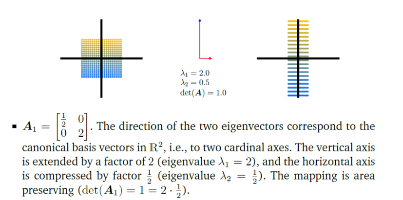 위의 그림은 기존의 2차원 벡터공간에서 특정 eigenvector와 eigenvalue를 가지고 eigenspace를 만들어 낸것을 보여준다. 우리가 고윳값과 고유벡터를 구하는 이유는 기존의 표준기저로 특정 좌표들을 설명하기 힘든경우가 있을 것이고, 힘들지 않더라도 쉽고 간단하게 나타내기 위해 축을 바꾸어 준다고 생각하면 된다. 그 축에 해당되는게 eigenvector들이 되고, 그 축으로 부터 상수배하며 손쉽게 좌표를 찍을 수 있게 해주는 것이 eigenvalue값들이다.