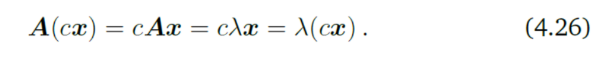 4.26 식은 eigenvalue가 유일하지 않다는 걸 말해주기 위함이다. 고유벡터는 상수 곱으로 또다른 고유벡터로 표현될 수 있다. $cx$도 $x$처럼 eigenvector가 될 수 있다.