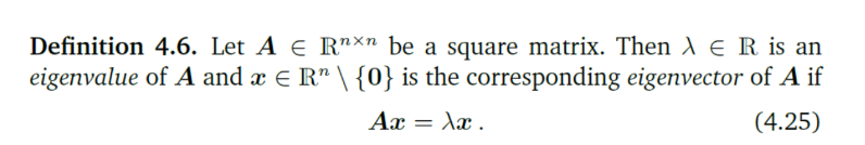 책에는 다음과 같이 eigenvalue equation을 정의하고 있다. $A$ 행렬에 대하여 eigenvalue $\lambda$와 eigenvector $x$를 보시라.