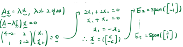 $E_{2}$를 먼저 구하고 같은 방법으로 $E_{5}$도 구하면 위처럼 두개의 eigenvector space를 구할 수 있게 된다.