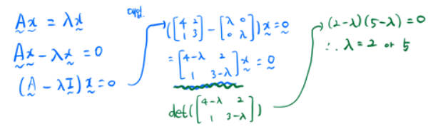 eigenspace $E_{\lambda}$는 homogeneous system으로 구할 수 있다. $(A - \lambda I)x = 0$ 를 통해서 말이다. $(A - \lambda I)x = 0$ 를 특성방정식(characteristic equation)이라 하는데 만약 좌변 $x$의 계수 부분이 역행렬이 존재하면 $x$는 항상 영벡터여야하니까 그러면 안되니까 특성방정식을 통해 역행렬이 없는 조건을 만족하는 $\lambda$를 찾는 것이다.
