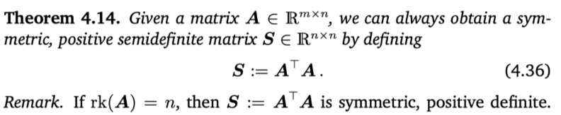 4.14가 말하고자 하는 것은 항상 symmetric하고 positive semidefine한 행렬은 4.36과 같이 직사각 행렬이여도 대칭행렬을 만들어 줄 수 있다는 것을 말한다. 게다가 그 랭크가 $n$이면 symmetric, positive define의 성질을 지닌다.