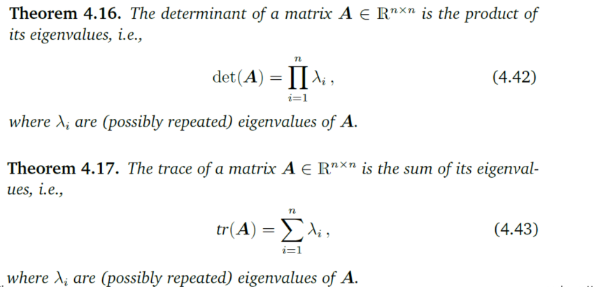 4.16, 4.17은 정방행렬일 때 eigenvalue의 곱, 합은 각각 determinant와 trace에 해당한다.
