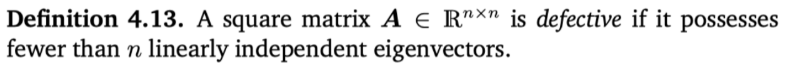 몇가지 더 알아보면, 정의 4.13과 같이 $n$차원의 한 정방행렬 $A$가 선형독립인 eigenvector의 수가 $n$보다 작으면 $defective$ 하다고 한다.