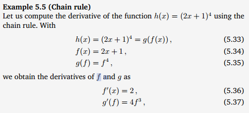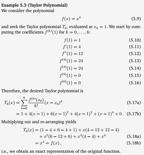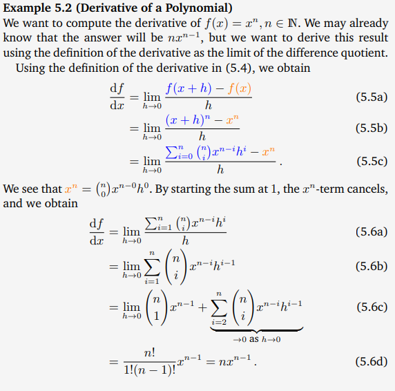 아래의 예제는 polynomial 에 대한 미분을 하는 과정을 나타낸 것이다. (5.6d)을 보면 공식처럼 외우고 있던 방법을 떠올리게 된다.