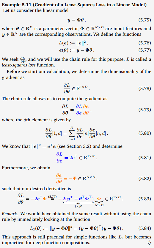 아래의 예제 5.11은 회귀분석의 회귀식을 떠올릴 수 있다. 예측치와 실제값과의 loss를 최소화하기 위한 gradient를 찾는 과정이다. 독립변수 $\Phi$ 벡터와, 회귀계수 $\theta$와 실제값(관측치) $y$에 대한 식으로 loss에 대해서 $L_{2}$ norm을 구하고(5.76), 이 $L$을 미분하여 gradient 를 구하고 이를 활용하여 loss를 최소화한다.