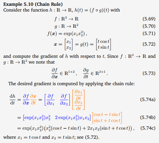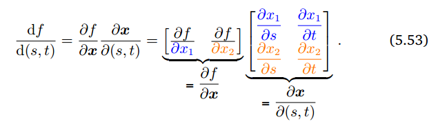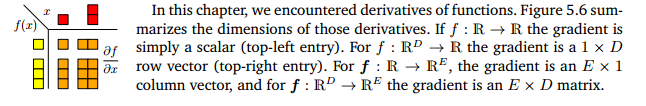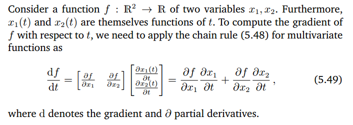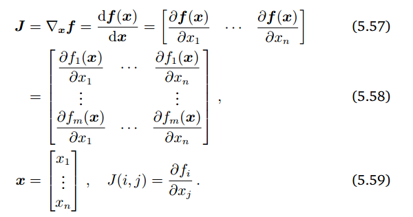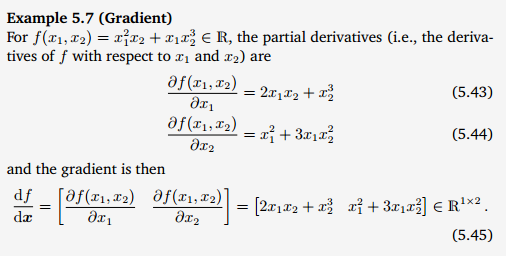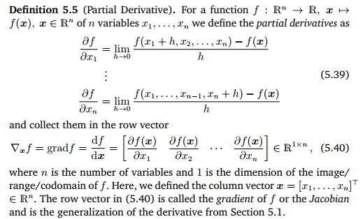 식 (5.39)는 하나씩 변수들에 대한 미분을 진행하고 이들을 모아놓은 것이 (5.40)이 된다. 이를 $f$의 gradient라고 한다.