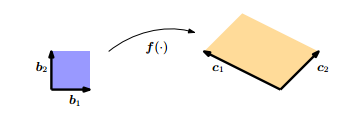 위의 그림처럼 f를 통해 선형맵핑을 한다고 해보자. $b$를 [(1,0), (0,1)], $c$를 [(-2,1),(1,1)] 이라고 하면, 쉽게 transformation matrix가 [(-2,1),(1,1)] 이라는 것을 알 수 있고 이를 식으로 나타내면 다음과 같다.