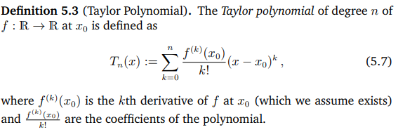 Definition 5.3은 $k$번의 미분으로 얻은 polynomial을 approximation하는 그래프들은 차수를 높일수록 특정 $x$에 대하여 설명을 잘 하게 된다. 여기서는 $x = 1$일 때는 기준으로 구한 것이기 때문에 그 주변에 대해서 approximation이 이루어 진다.
