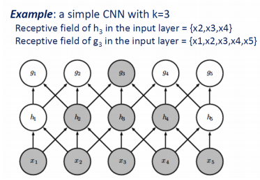 receptive field를 크게하고 싶으면 kernel size를 크게하거나 layer를 여러개 쌓는다. 아래의 경우 $h_{2}, h_{3}, h_{4}$는 각각 receptive field size가 3이다, 반면$g_{3}$는 $x_{1}, x_{2}, x_{3}, x_{4}, x_{5}$를 receptive field로 받아 size가 5가 된다.