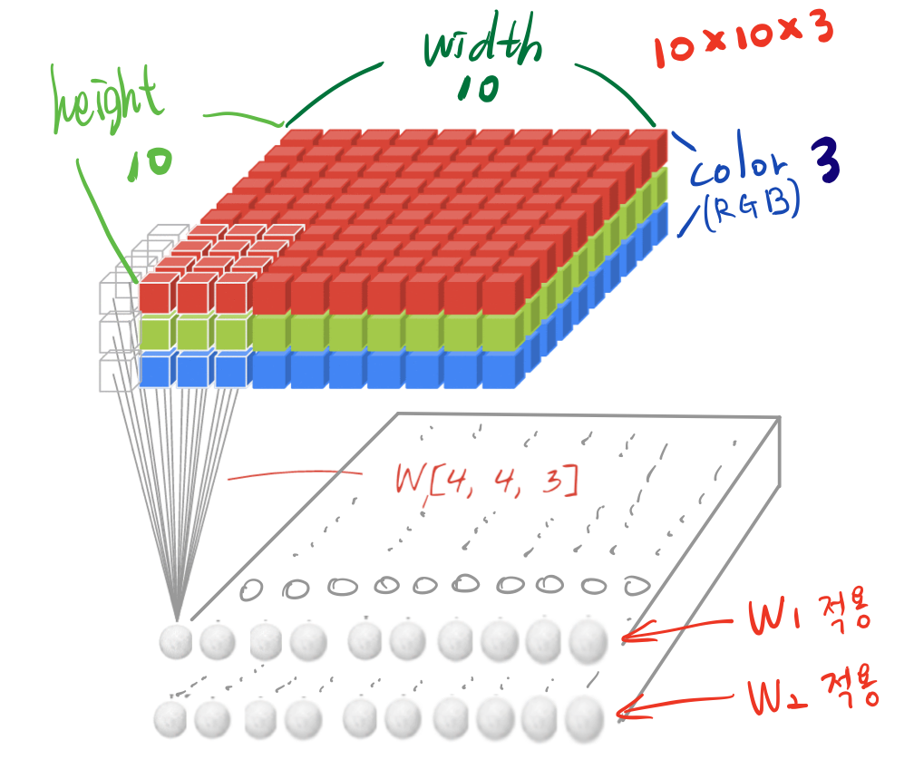 다음과 같은 데이터(10x10x3)를 convolution 한다고 해보자.