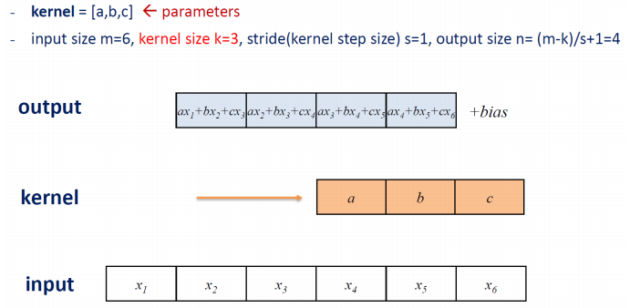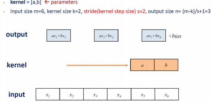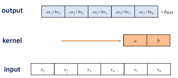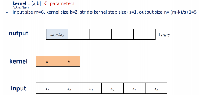 kernel이 두개의 parameter를 가지고 있기 때문에 kerner size = 2라고 한다. 앞선 네트워크에서 dense layer에서 모든 input노드들에 대해서 weighted sum을 진행했지만, kernel에서는 kernel size만큼의 input 노드들의 weighted sum을 한다.