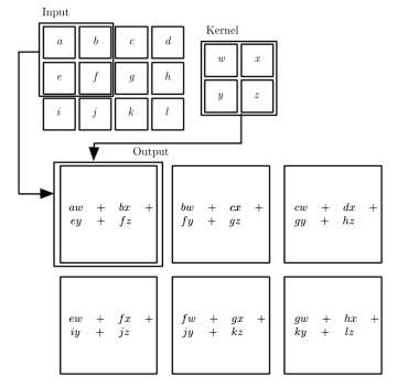 3 x 4 2D tensor를 2 x 2 array 형태의 kernel로 convolution 하면 sliding 해가면서 weighted sum을하여 output을 산출한다. 이 output node은 scalar값으로 모여서 결국 행렬로 나타나는 과정을 통해 3 x 4 행렬을 2 x 2 행렬로 convolution 한 일련의 과정을 알 수 있다.