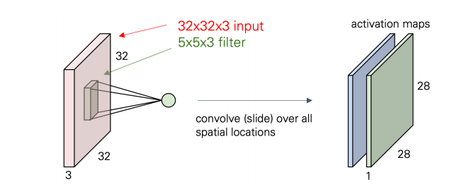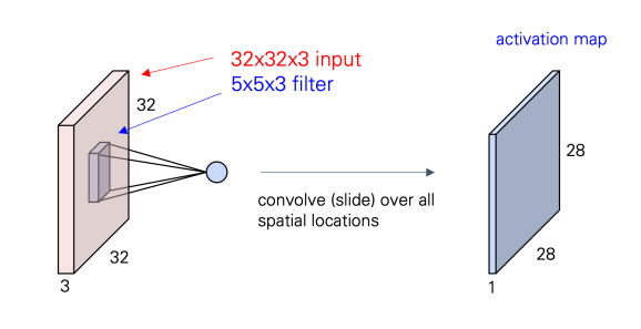 input 이 32x32x3 인 3 dimension 이고, 5x5x3 인 75 개의 weight를 갖는 filter이다. filter를 거치면서 scarlar들이 output 으로 나오면서 28x28x1과 같은 array가 생성된다. 이 activation map(feature map)은 기존의 input에서 filter의 가중치 행렬과의 weighted sum을 한칸씩 slide해가면서 하기 때문에 padding이 없으니 28번 옆으로 이동하면서 weighted sum을 계산하고 그러다보면 오른쪽 결과와 같은 dimension을 가지는 output이 된다.