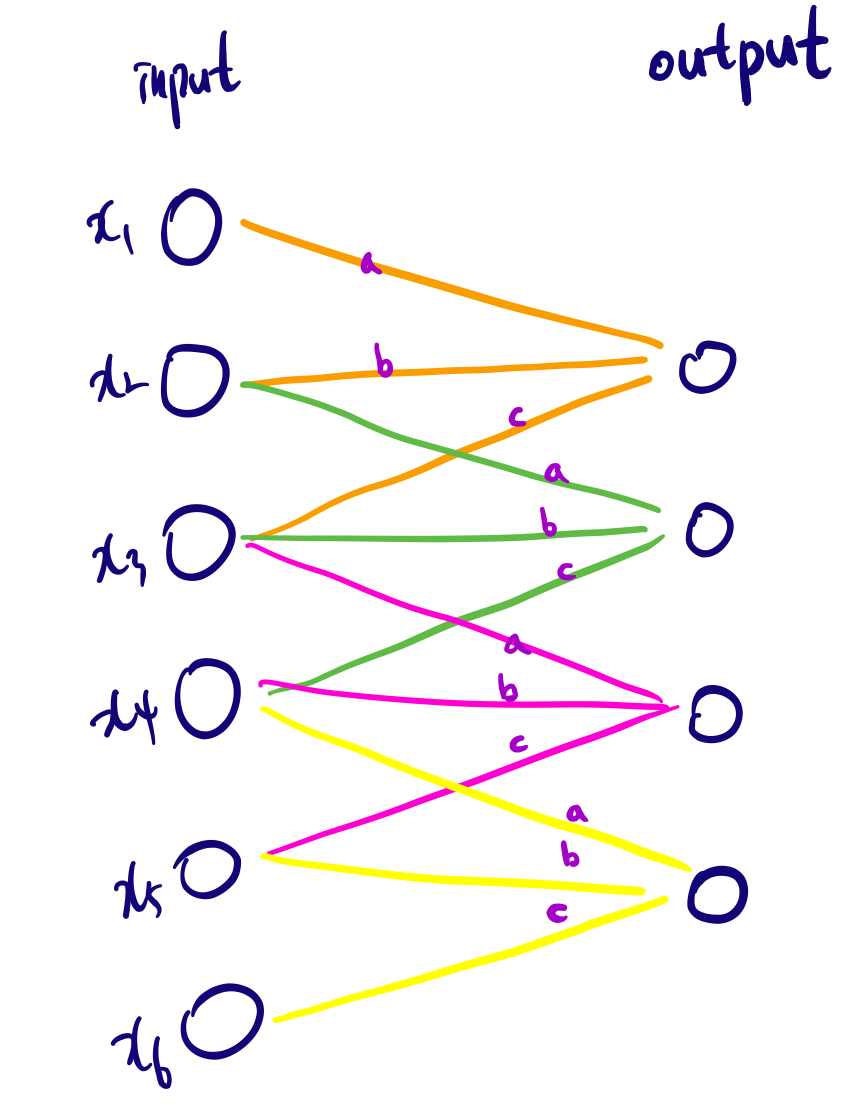 Convolution은 어떻게 연산이 진행될까, 1 Dimension Array input이 아래에 있다. 방금 말한 filter를 kernel이라고 부르기도 한다. kernel이 a,b라는 parameter일 때, input x이 1 dim으로 size가 6이다.