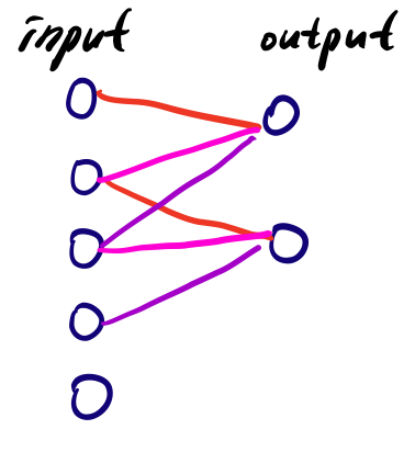 위의 그림을 네트워크 그림으로 표현하면 아래의 그림과 같이 나타낼 수 있다. dense layer 처럼 full connection 과 차이가 있다는 것을 염두에 두자. dense layer의 경우에는 output 노드의 개수를 parameter로 주었다. 그럼 자동적으로 hidden node의 수와 input 들이 완전 연결을 가지게 된다. 하지만, convolution에서는 output 노드의 개수를 명시적으로 선언해주지 않는다. 그렇기 때문에 위 그림의 output size 처럼 kernel size, stride size에 따라서 결정이 된다. 이러한 차이점이 있다.
