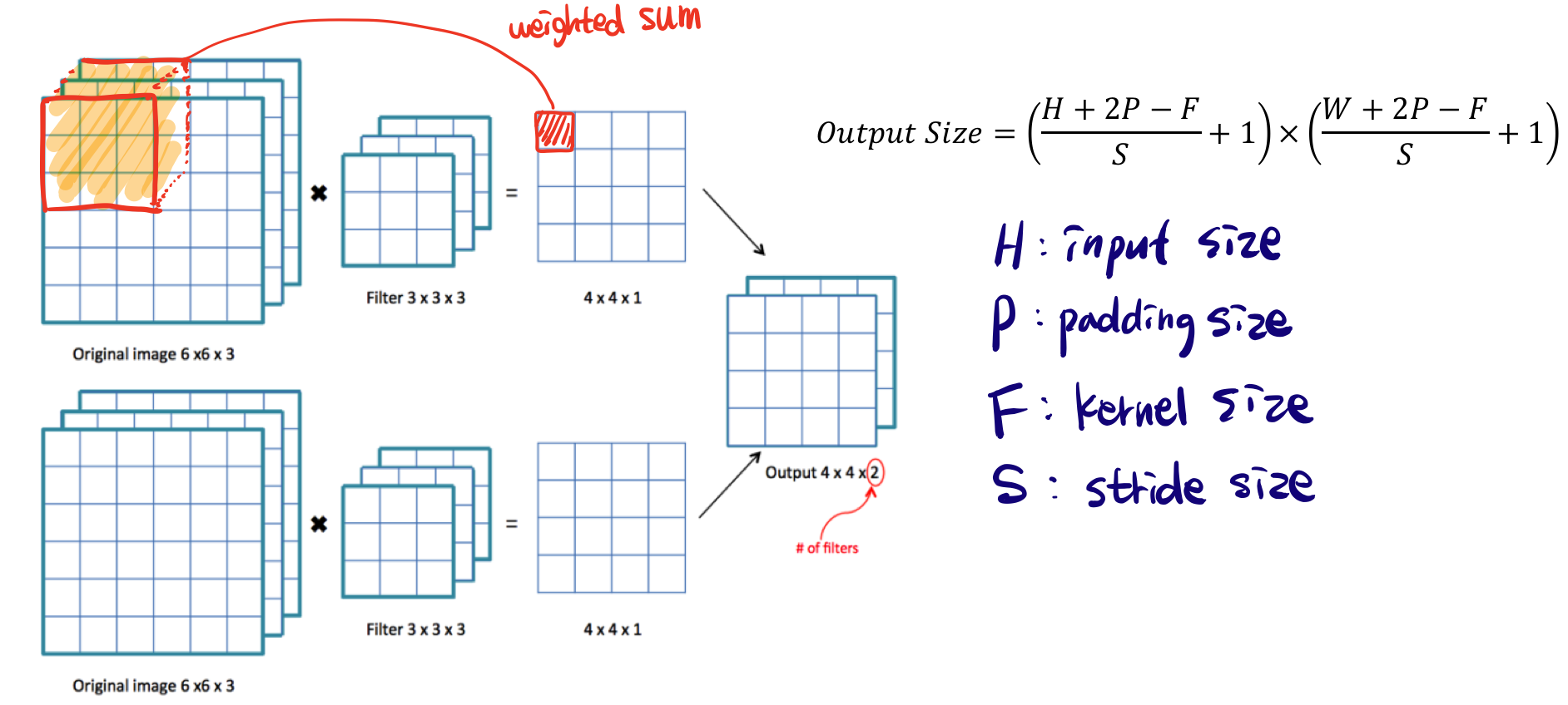 아래는 서로다른 Filter가 2개 있고 각각 convolution을 하는 모형이다. output shape는 오른쪽의 공식에 따라 쉽게 구할 수 있다. padding에 대해서는 후에 다뤄 설명은 하지 않고, 여기서 padding은 0이므로 신경쓰지 않고 계산하면 6x6x3 input을 3x3x3 filter를 거쳐 4x4x1 activation map을 구하고 각각 map을 결합하면 최종적으로 activation map 4x4x2 가 된다. 여기서 4x4x2 에서 2는 filter의 개수를 나타낸다.