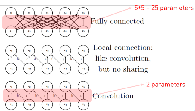 아래의 그림을 보면 convolution 을 fully connected 와 비교하면 추정해야 하는 parameter의 개수부터가 줄어드는 것을 알 수 있다.. 그 이유는 앞서 언급했던 것처럼 input노드는 parameter를 local 하게 본다는 점과 이 parameter를 sliding하면서 공유한다는 것이다.