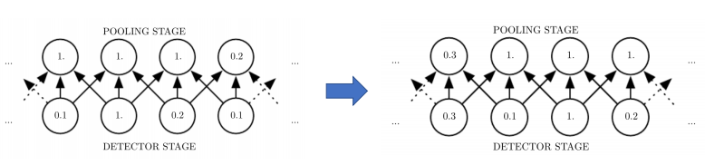 pooling의 성질은 Invariant to small translations of the input 가 있다. 이말은 input에 약간의 translation을 주어도 변하지 않는 다는 말이다. 예를 들어 아래의 그림 중 왼쪽을 보면, kernel이 3인 것에 대해서 1 dimension으로 pooling한다. 그러므로 3 개 중에 하나를 뽑은게 되는 것이다. 그리고 input이 오른쪽 처럼 한칸씩 shift되었다고 해보자. 여기서 shift는 translation 했다고 한다. 자, small translation이 발생했다. 이상태에서 pooling을 해보면 왼쪽, 오른쪽 모두 pooling stage 부분에 가운데 두개의 노드는 translation(여기선 shift)했음에도 값의 변화가 없는 것을 볼 수 있다. 왜냐하면 어차피 pooling이라는 것은 local영역에서 대푯값을 뽑는거기 때문에 window상에서 움직여봤자 invariant하게 된다.