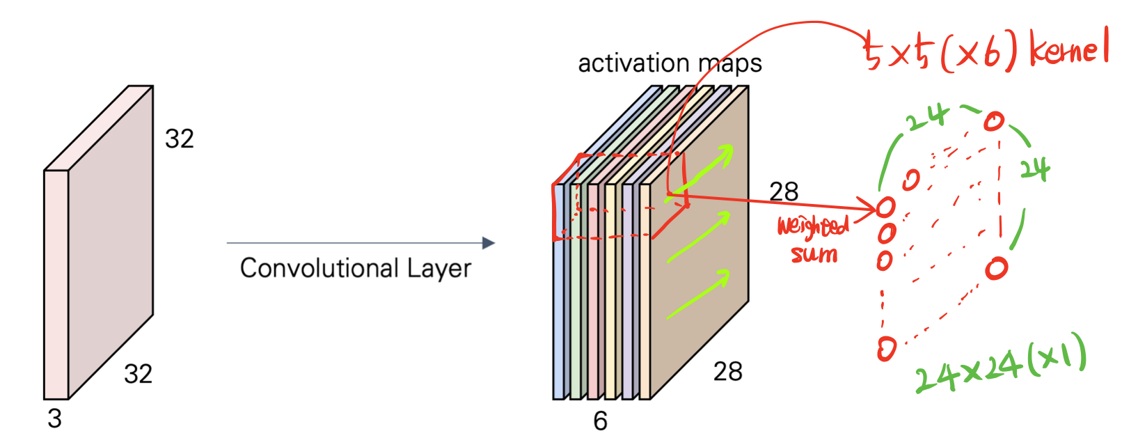 kernel size 가 5x5(x3) 로 convolution을 각기 다른 filter로 6번 수행하고 output을 쌓으면 activation map(feature map)이 된다.