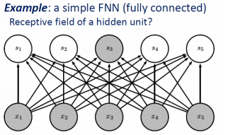 dense layer의 fully connected의 경우에는 아래의 그림처럼 각 output 노드의 receptive field size가 5가 될 것이다.