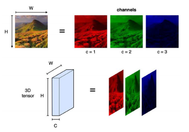 컬러이미지의 경우에는 red, green, blue 각각 2D array 가 겹겹히 쌓여있는 3D tensor로 인식하게 된다.