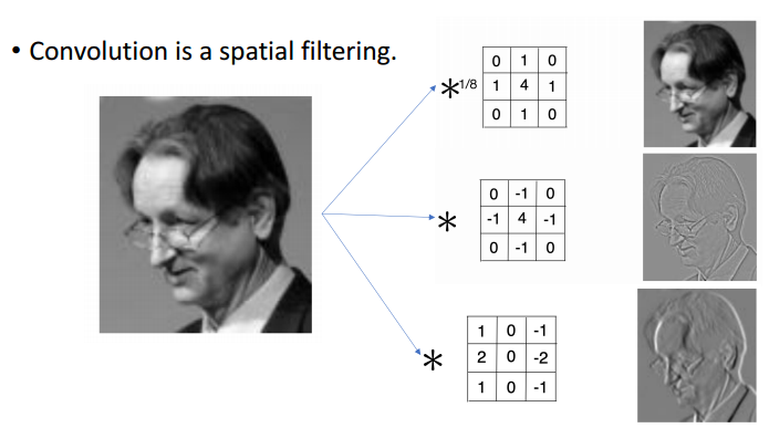 사진같은 이미지에 필터를 넣는 작업을 해보았을 것이다. Convolution은 data에 spatial하게 filtering을 해주는 것이라 생각하면 된다. 뉴럴 네트워크의 대가 제프리 힌턴(Geoffrey Everest Hinton)의 사진이다. 이 사진에 오른쪽에 있는 각기 다른 array를 입혀줌으로써(convolve) 다른 결과를 출력하게 된다. 두번째는 엣지효과, 세번째는 음각효과 같은 특징을 지녔다는 것을 유추해 볼 수 있다.