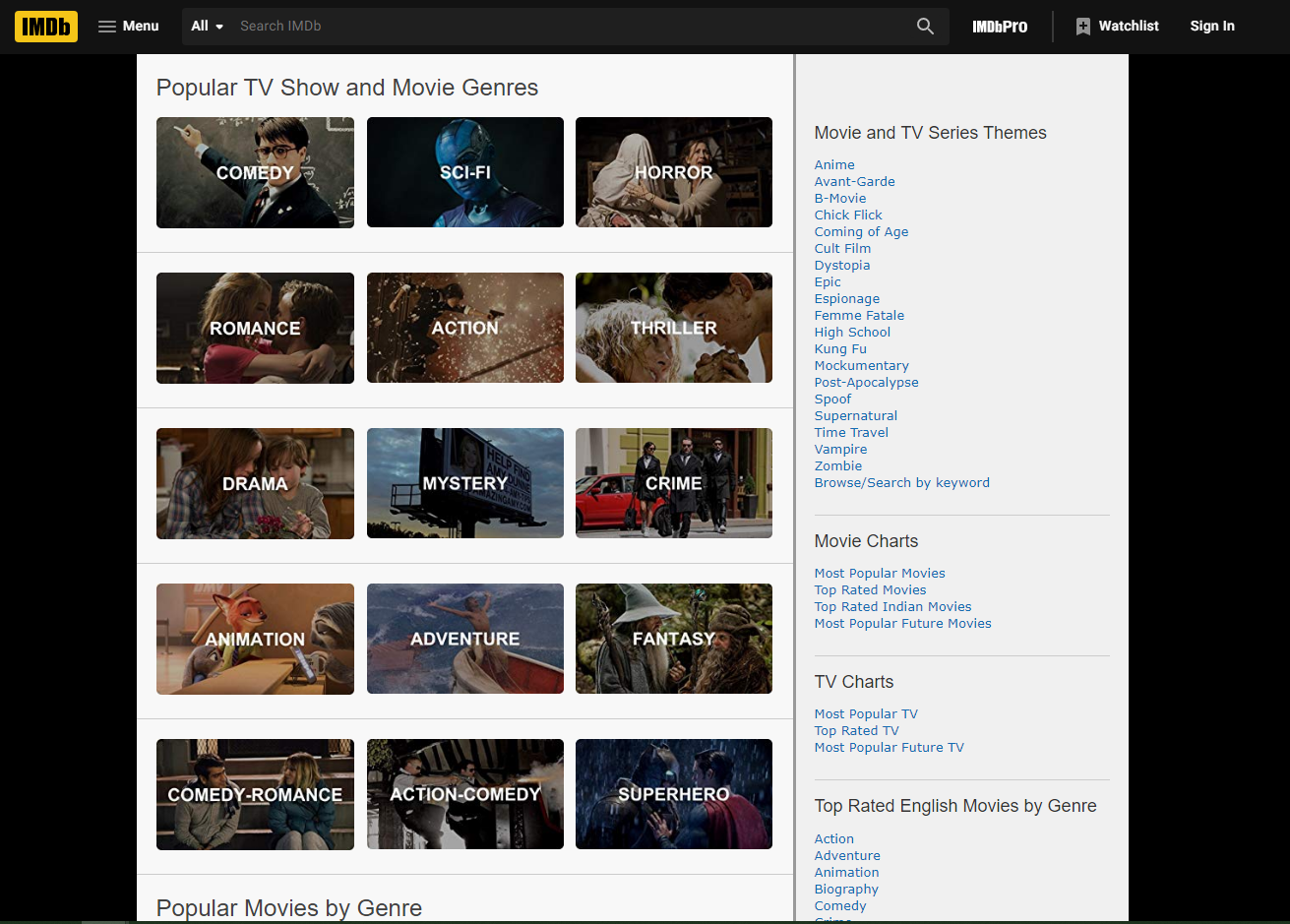 사이트에서 "Browse by Genre" 배너에 들어온 화면입니다. 여기서 저는 COMEDY, SCI-FI, HORROR, ROMANCE, ACTION 이 다섯개의 장르에 해당하는 영화의 댓글을 수집하였습니다.