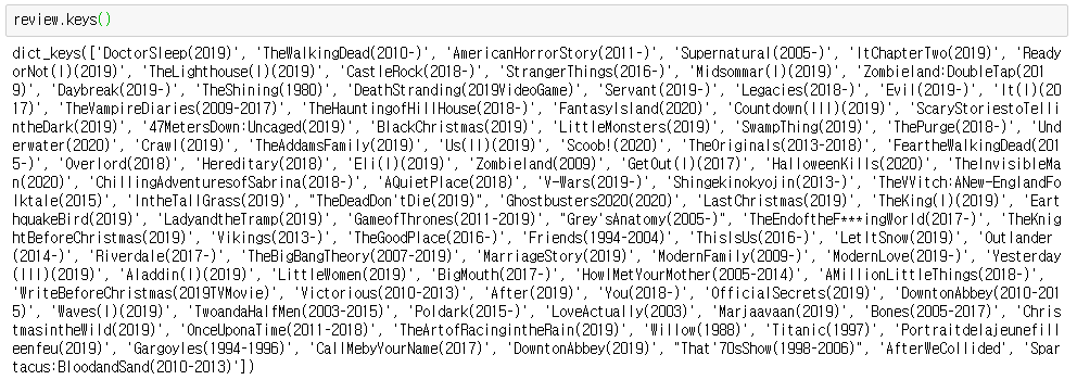 review[h1] = [comment,rating,genre[i]] # 영화이름: [[댓글,댓글,댓글,댓글], rating, genre]