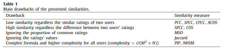 위의 정리한 유사도를 포함한 여러 유사도들의 단점을 정리한 표[8]는 아래와 같다.