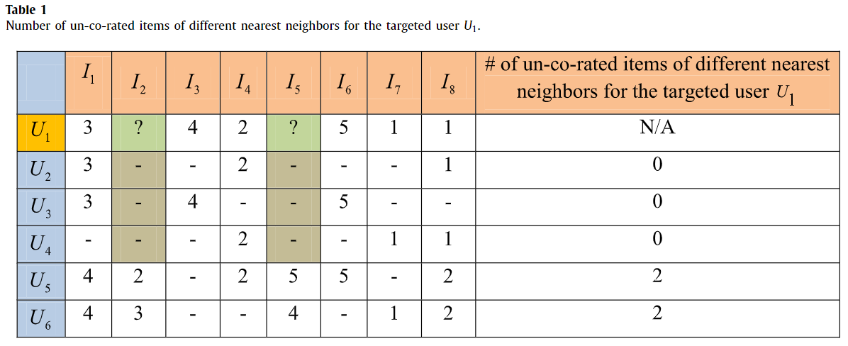 Table 1은 target user $U_{1}$ 에 대해서 nearest neighbors 들과 비교했을 때, $U_{1}$이 매기지 않은 것에 대해서 이웃들이 각각이 평가한 항목이 몇 개인지를 카운트한 표이다. Table 2는 $U_{1}$이 평가한 항목들 중에서 이웃들은 평가하지 않은 항목의 개수를 카운트한 표이다. '-' 표시는 missing rating을 뜻한다.