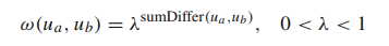 위와 같이 $sumDiffer(u_{a}, u_{b})$ 를 hyperparameter $\lambda$ 에 지수로 사용하여 $w(u_{a}, u_{b})$ 를 얻는다. 람다는 0과 1사이의 값이라 제곱할수록 값이 0에 가까워지게 되는데, $sumDiffer(u_{a}, u_{b})$ term 이 람다의 지수로 들어가기 때문에 작으면 작을 수록 좋다. 즉 오차가 작을 수록 가중치는 커지게 되는 결과를 얻게 된다.