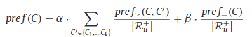 위의 정의를 살펴보면, $C$ 는 rating 을 할 수 있는 rating 값들의 집합이다. 평점이 1에서 5점까지 있다고 한다면, C={1, 2, 3, 4, 5} 이다. $\alpha$ 와 $\beta$ 는 hyperparameter로써 각 term에 비중을 얼마나 줄 것인지를 제어한다. 논문에서는 $\alpha$ 를 1.0, $\beta$ 를 0.5 로 두었다. 이말인 즉슨, 동일하게 평가한 아이템들이 많을 수록 $C$에 포함된 해당 점수에 대해 penalty를 주게 된다.