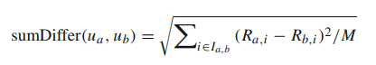 위의 $sumDiffer(u_{a}, u_{b})$ 는 두 사용자 간의 오차제곱합의 평균이라고 생각하면 된다. MSE 같은 개념인데, 이를 활용하게 되면 평점이 가지는 scale을 위의 MSD가 가진 scale을 고려하는 특징을 사용할 수 있게 되는 것이다.