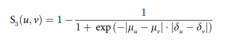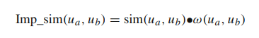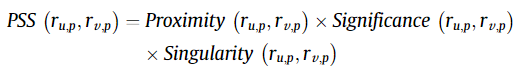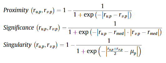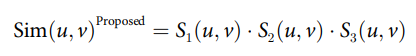 [5] 는 [4]논문을 참조해서 그 유사도 구하는 과정에서 참조하면서 낸 논문으로 보인다. 아래와 같이 $Sim(u,v)^{Proposed}$ 는 세가지 유사도를 곱한 값으로 구해지는데, 하나씩 살펴보도록 하자.