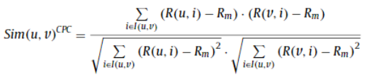 PCC 에서 파생된 Constrained Pearson's Correlation Coefficient (CPCC). PCC와는 다르게 분자와 분모에 평균대신 중앙값을 사용한다. correlation 이 증가하기 위해선 두 사용자의 rating 쌍이 둘 다 positive이거나 negative 인 경우여야 한다.