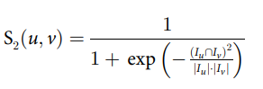 $S_{2}(u,v)$ 는 아래와 같다. 이 term이 말하고자 하는 것은 동시 평가된 항목들이 많을수록 더 중요하다고 판단, 동시 평가 항목의 비율이 클수록 $S_{2}(u,v)$의 값도 커진다. 시그모이드 input $x$ 에 들어간 term을 보면 co-rated 평점 개수를 제곱한 값을 각 평점 개수 곱한 것으로 나눈다. 이말인 즉슨 동시 평가한 항목에 제곱을 줌으로써 그 가중치를 많이 주겠다는 의미이다.