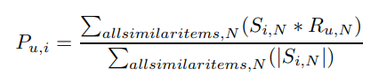 최종적으로 아래와 같이 사용자 $u$가 $i$에 내릴 예측 평점은 가중평균을 통해 구하게 된다. 명시는 되어 있지 않지만 $N$은 사용자 $u$가 평점을 매긴 아이템들의 집합인 것 같다. 그리하여 $N$ 의 각 아이템과 $i$와의 유사도에 사용자가 내린 평점들의 가중평균으로 예측 평점이 계산된다.