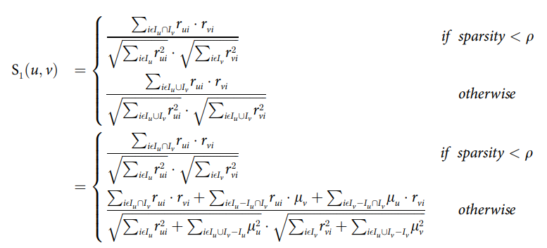 먼저 강조하고자 하는 부분은 sparsity를 연구자가 지정한 임계치 $\rho$ 보다 작은 경우에는(sparse 하다.) 기존의 코사인 유사도를 구하듯이 구하지만, 분모를 보면 알겠지만, 공통 평점 집합이 아니라 각각 평가한 평점들에 대한 norm2를 구해서 곱하는 것을 알 수 있다. 즉 한 사용자가 매긴 평점 모두를 사용하겠다는 것이다.