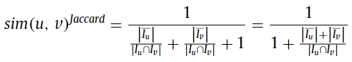 아래의 식이 표현하고 있는 것은 자카드 유사도는 co-rated 평점개수와 비례한다는 점과 $|\bar{I}_{u}|$ + $|\bar{I}_{v}|$ 의 역수인 $(|\bar{I}_{u}| + |\bar{I}_{v}|)^{-1}$ 와 비례한다는 것이다.