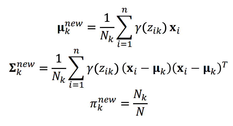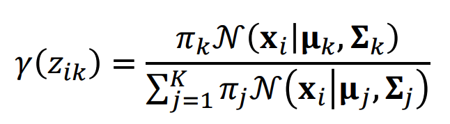 샘플들의 클 $\gamma(z_{ik})$ 를 안다고 가정하면, $\mu_{k}, \Sigma_{k}, \pi_{k}$를 구할 수 있다. 반대로 $\mu_{k}, \Sigma_{k}, \pi_{k}$ 를 알면 $\gamma(z_{ik})$를 구할 수 있다. 그래서 여기서 이 두개를 분리해서 계산을 한다. 하나하나 값을 산정해줄 수 없는 상황이기 때문에 티키타카를 해야한다.
