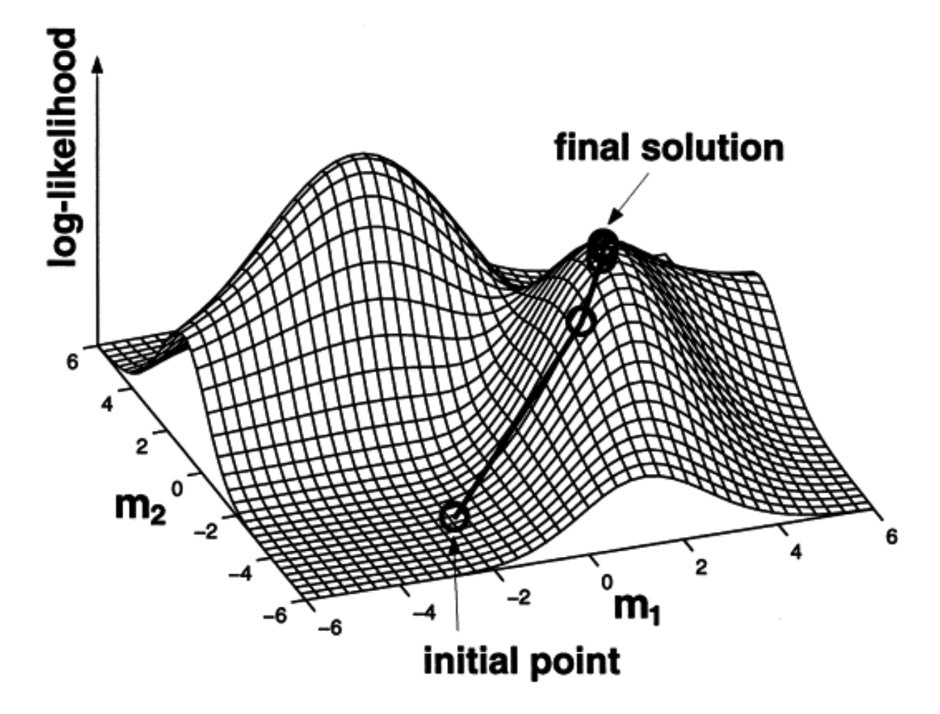 objective function 이 주어졌을 때, 최적화 문제를 푸는 방법은 다양하다. EM 알고리즘의 경우는 maximum likelyhood 나 posteriori(MAP) 설정되어 있는 목적함수의 parameter를 찾는 방법이다. 매 step마다 해를 변경해가면서 최적의 parameter를 찾아간다. EM 알고리즘의 경우는 서로 다른 step을 번갈아가면서 해를 찾아간다. 그 step은 E와 M으로 나뉜다.