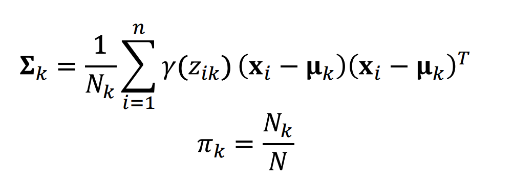 3. Maximization 단계이다. 구한 responsibilities 를 가지고 k 개의 정규분포의 평균, 공분산행렬, prior probability($\pi_{k}$)를 업데이트 할 수 있게 된다.