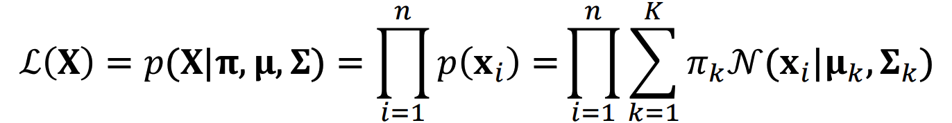 우리가 가정한 상황하에서 p(x)의 marginal distribution을 구하였다. 이제 관찰한 x를 가지고 $\pi_{k}, \mu_{k}, \Sigma_{k}$ 를 구해야한다. 그래서 likelyhood function을 계산해야한다. 각 샘플이 모두 독립적이다 가정을 하기 때문에 p(x)의 marginal distrubution에서 $x_{i}$값을 넣어 n 개의 샘플들에 대해서 모두 곱한 것이 곧 likelyhood function이 된다. 그래서 위의 수식에서 본 것을 합쳐주면 아래의 우항의 수식을 얻을 수 있다. 일반적으로 확률값들을 곱하는 것이다보니 log를 취하여 계산하게 된다.