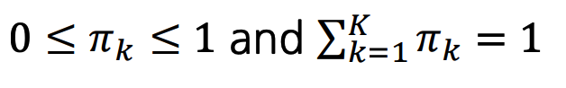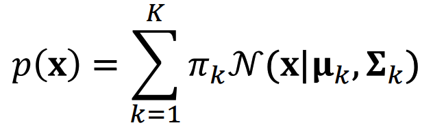 아래의 수식을 보면 어떤 데이터에 분포를 알기 위해 K 개의 클러스터 즉, 정규분포가 있고, 각 분포들의 혼합으로 결정되어 있는 것을 볼 수 있다. 괄호 안에 평균 벡터 $\mu$와 공분산행렬인 $\Sigma$을 볼 수 있다. 그리고 $\pi$는 prior probability 사전확률이라고 하는데, 각각 클러스터들의 확률 즉, 정규분포마다의 비중을 나눠준다. 그래서 0~1 사이의 값을 가진다.