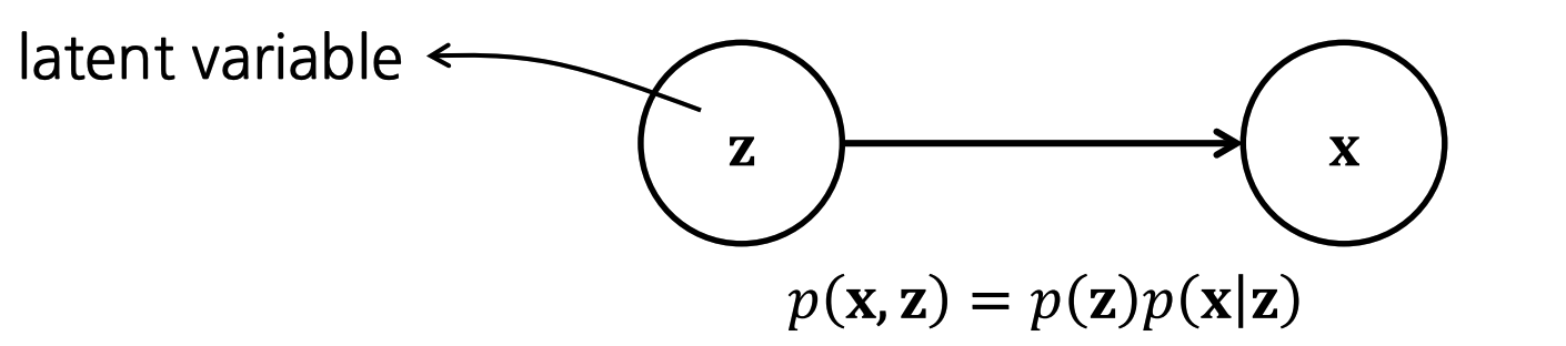 아래의 z는 특정 샘플이 어느 분포에서 왔는지를 나타내는 값이라고 생각하자. 우리는 현재 x 값만 관찰한 상태이다. 그렇다면 z는 k 개의 정규분포 중에서 한군데에서 뽑힌 것일 텐데 어느 정규분포에서 뽑혔는지는 알기 힘들어 latent variable이라고 부른다.