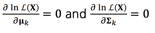 이제 likelyhood function을 최소화하기 위해서 아래와 같이 $\mu_{k}, \Sigma_{k}$를 편미분하여 0이 되게 하는 계산을 수행한다.