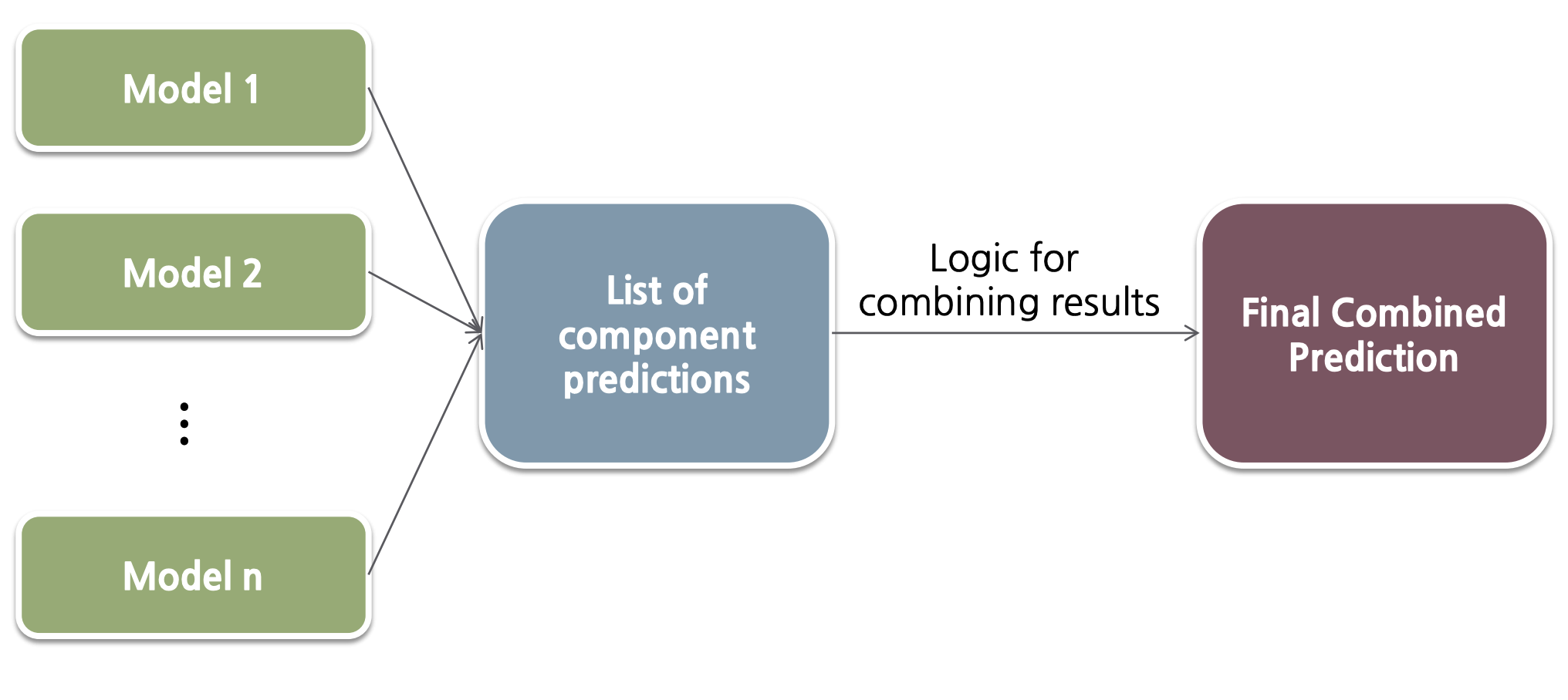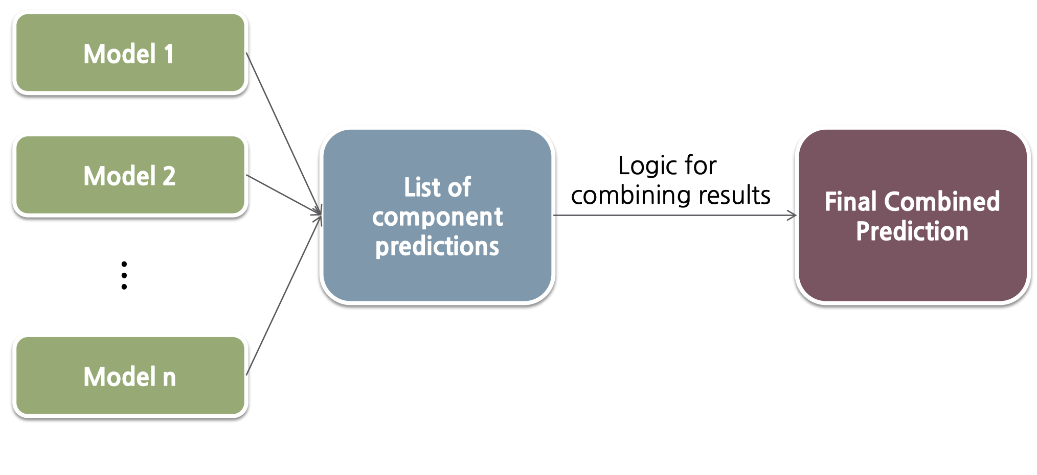 여러개의 모델을 합쳐서 최종적으로 예측을 하기 때문에 중점적으로 고려해야하는 것은 어떻게 서로 다른 모델들을 주어진 데이터를 이용해서 만들어낼 것인가와 각 모델의 결괏값을 병합할 것이냐가 있다.