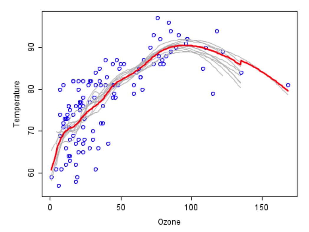 아래의 그래프는 배깅을 했을 때가 개별모델을 사용했을 때보다 얼마나 안정적인 지를 보여주는 그림이다. 회색의 선은 100개의 서로 다른 부트스트랩 표본으로부터 얻어진 smoothing 결과이고 빨간선은 100개의 결과를 종합한 선이다. 확실히 평균을 나타낸 빨간선이 더 stable 하고 noise한 지점에 대해 overfit이 덜 한 경우를 알 수 있다. 일반적으로 부트스트랩을 이용해서 모델을 합쳐 사용하게 되면 최종 모델의 bias는 크게 증가시키지 않으면서 noise에 크게 영향을 받지 않게끔 할 수 있다.